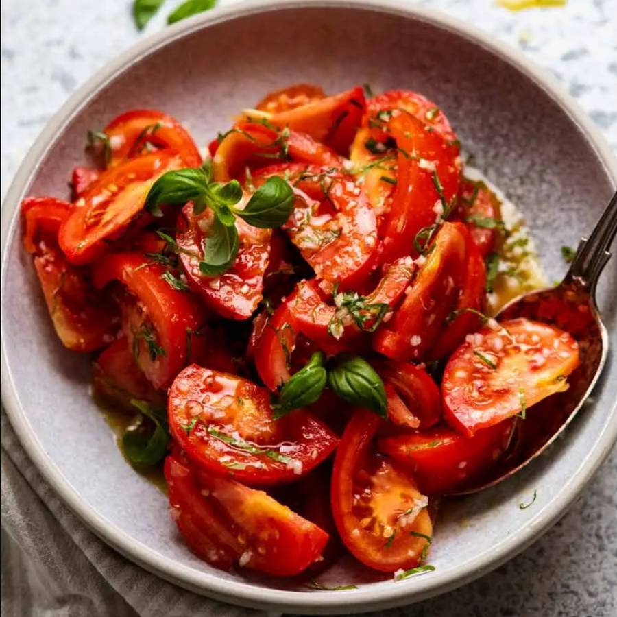 Dùng một cái bát, trộn cà chua với nước sốt thì là ở trên, trộn đều và thưởng thức