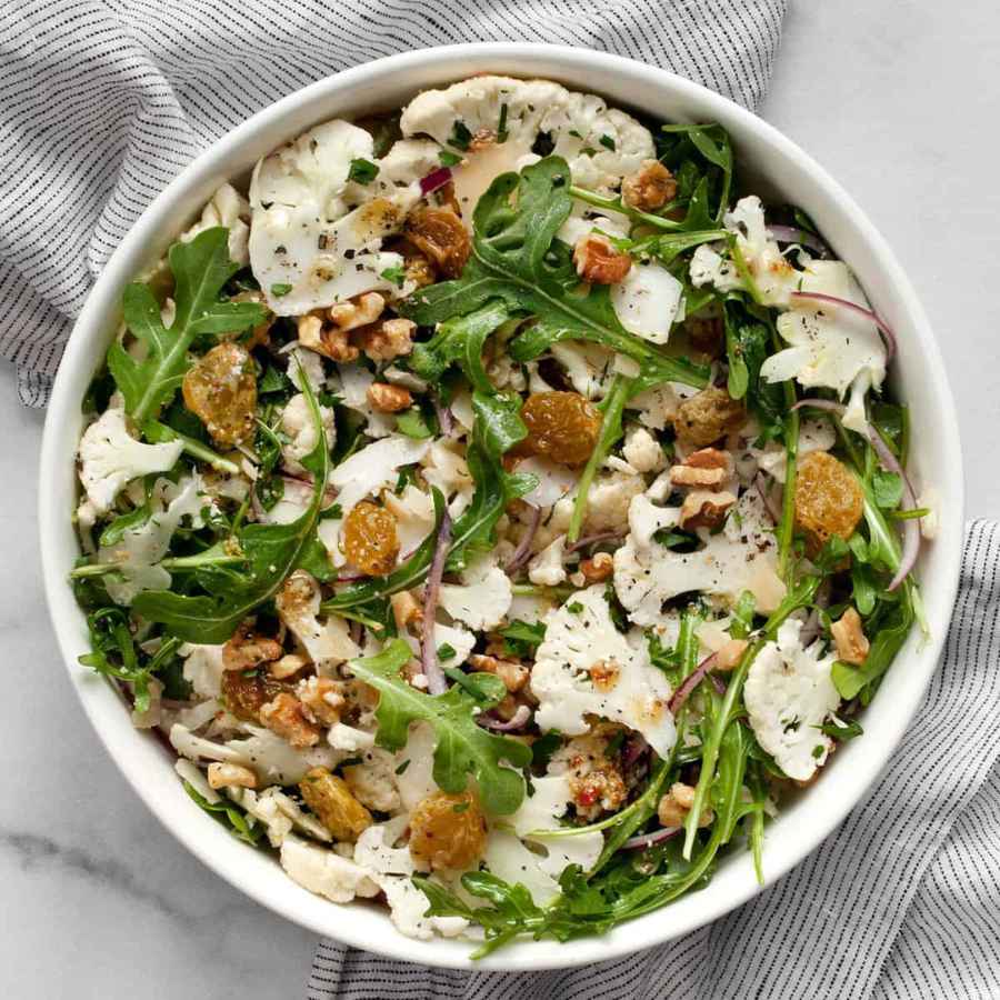 Dùng một chiếc bát, trộn cơm súp lơ với rau cải lông, cải chíp và các thành phần nguyên liệu khác, trộn đều, chia thành các bát nhỏ hơn và thưởng thức