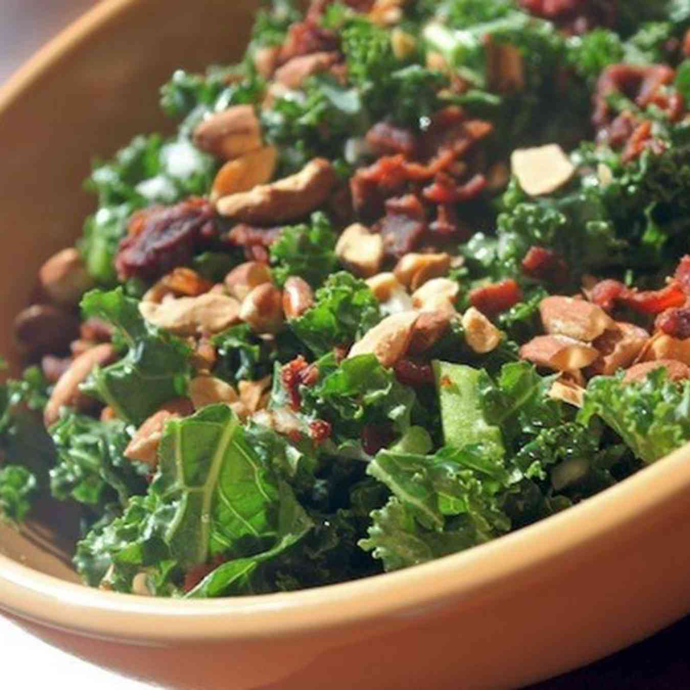 Vắt cải xoăn cho ráo nước, sau đó cho cải xoăn vào một chiếc bát salad cỡ lớn và rưới nước sốt lên trên. Sau đó cho thịt heo xông khói và phô mai Parmesan vào rồi thưởng thức
