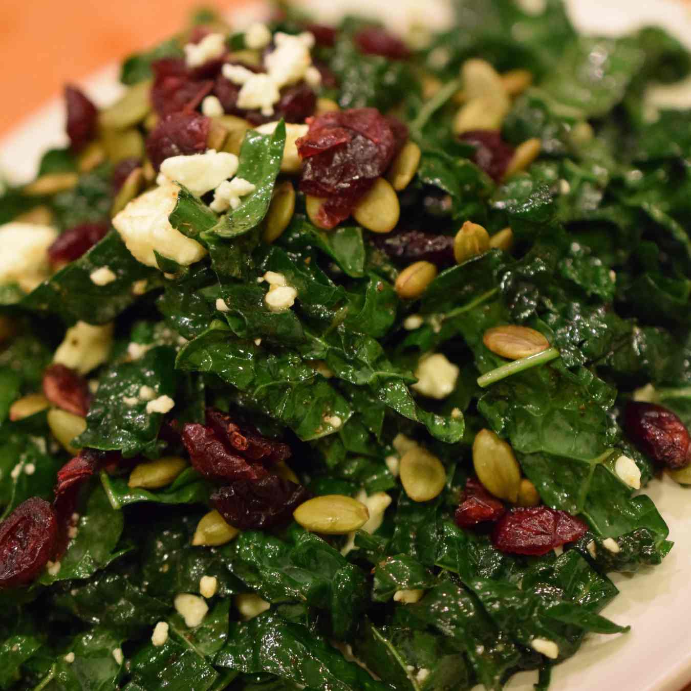 Dùng một bát salad, trộn cải xoăn với hạt bí ngô, hành tây, dầu, nước cốt chanh, húng quế và tỏi, cắt hạt lựu và thưởng thức