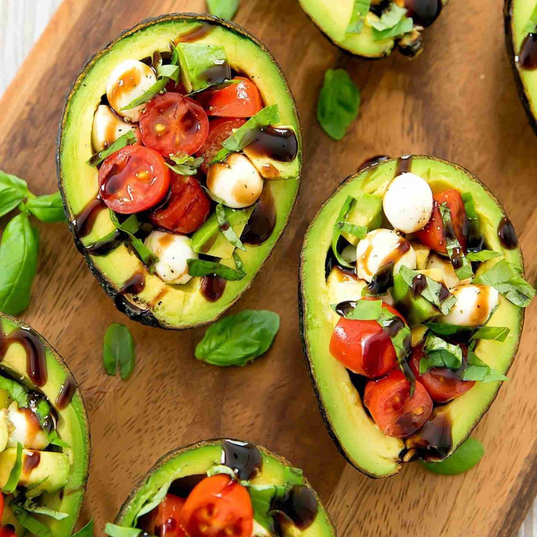 Cho cà chua vào bát và trộn đều. Sau đó chia đều hỗn hợp vào các quả bơ đã cắt nửa. Rắc húng quế tươi và hạt tiêu đen lên trên và thưởng thức