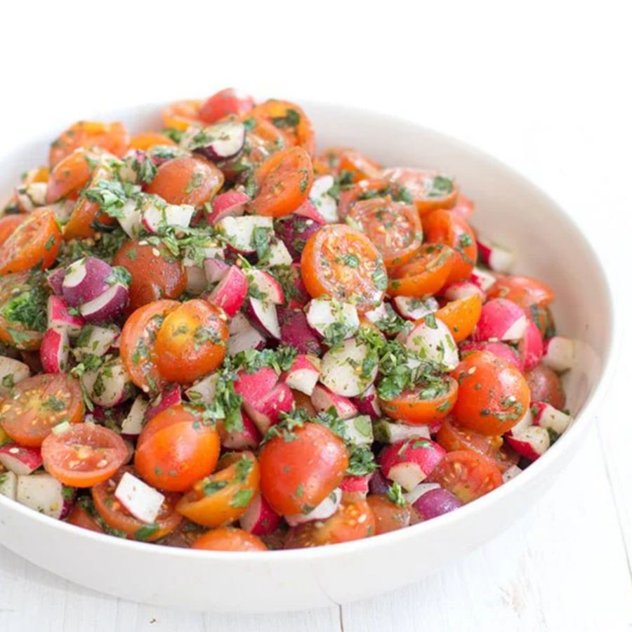 Dùng một cái bát, trộn cà chua với củ cải đỏ và các thành phần nguyên liệu khác, trộn đều và thưởng thức