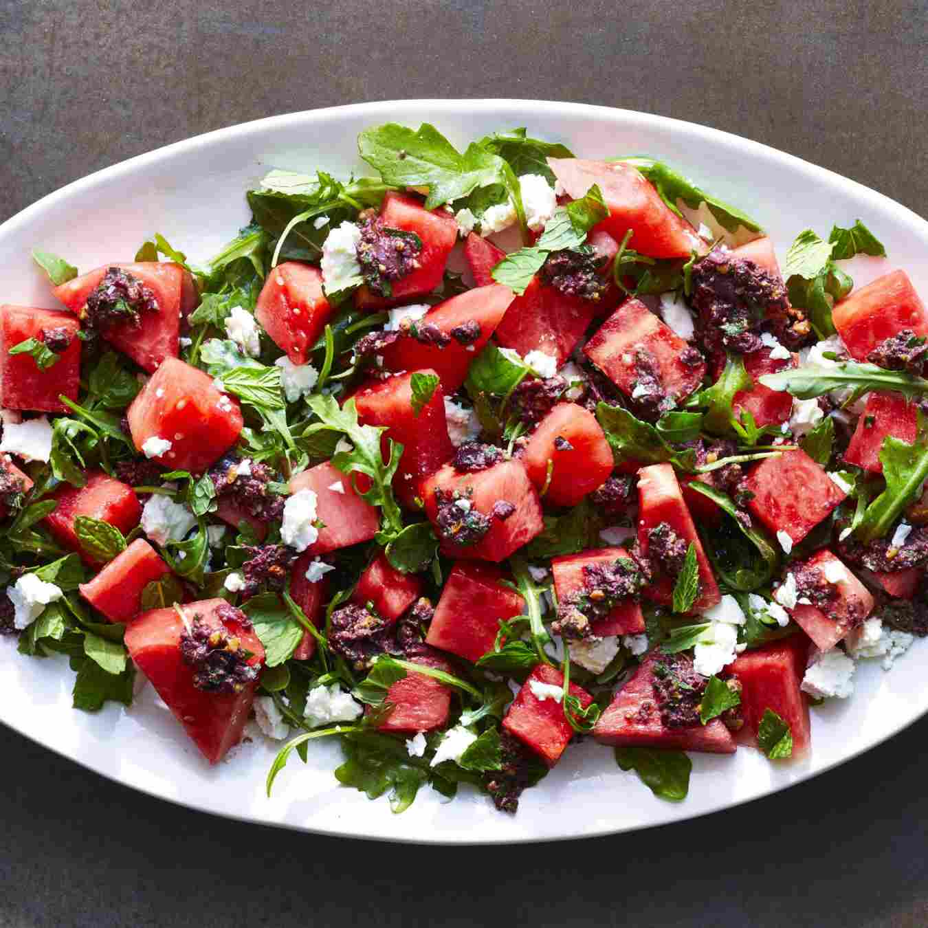 Dùng một bát, cho dưa hấu với ôliu và các thành phần khác vào, trộn đều, chia vào các bát nhỏ hơn và thưởng thức