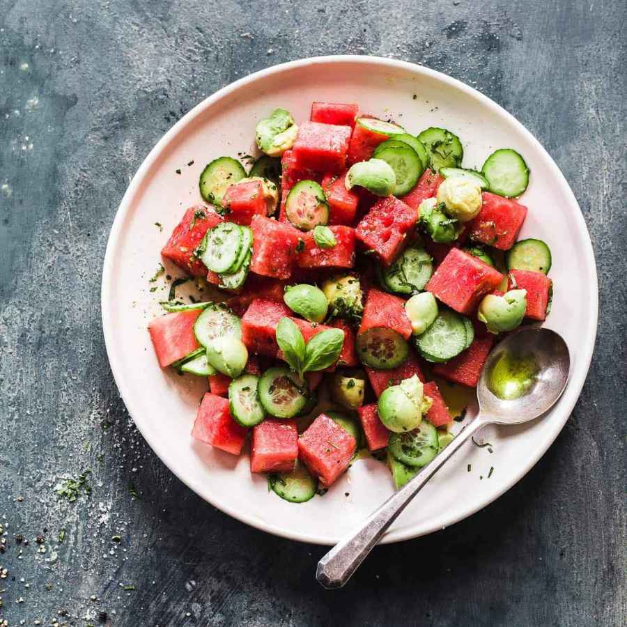 Dùng một cái bát, trộn đậu bắp với dưa hấu, dưa chuột và các thành phần nguyên liệu khác, trộn đều và thưởng thức