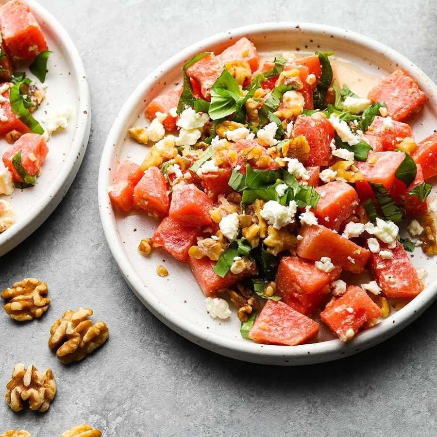 Dùng một cái bát, trộn dưa hấu với các loại hạt, hành tăm và các thành phần nguyên liệu khác, trộn đều và thưởng thức