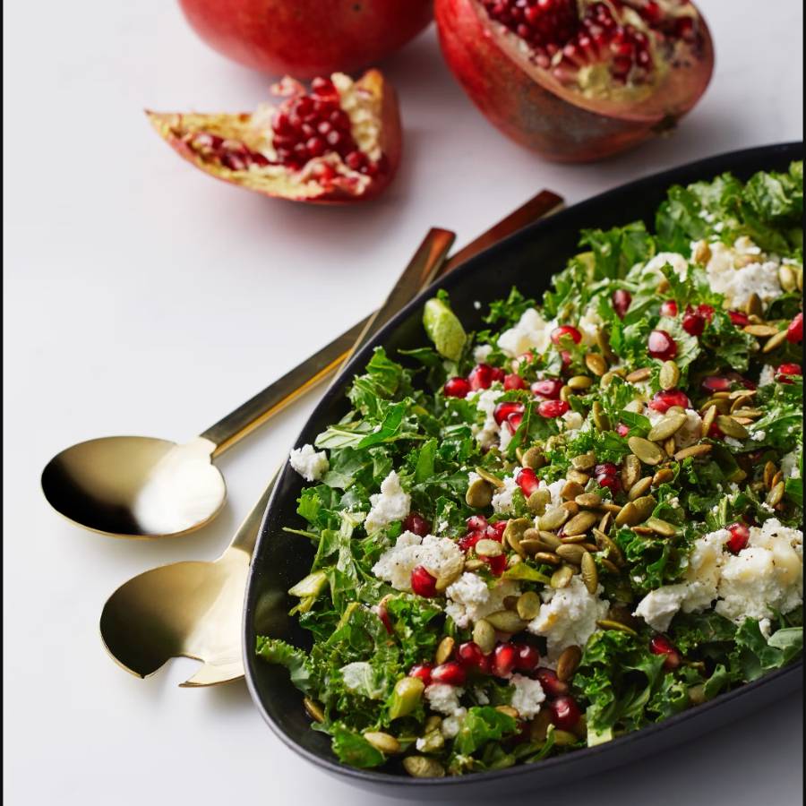 Dùng một cái bát, trộn cải xoăn với hạt điều, hạt lựu và các nguyên liệu khác, trộn đều, chia ra đĩa và thưởng thức