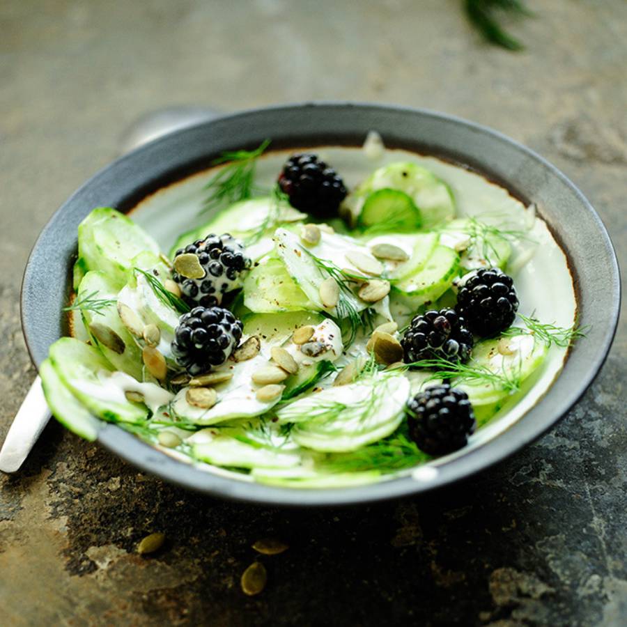Dùng một cái bát, trộn dưa chuột với quả mâm xôi đen và các nguyên liệu khác, trộn đều và thưởng thức