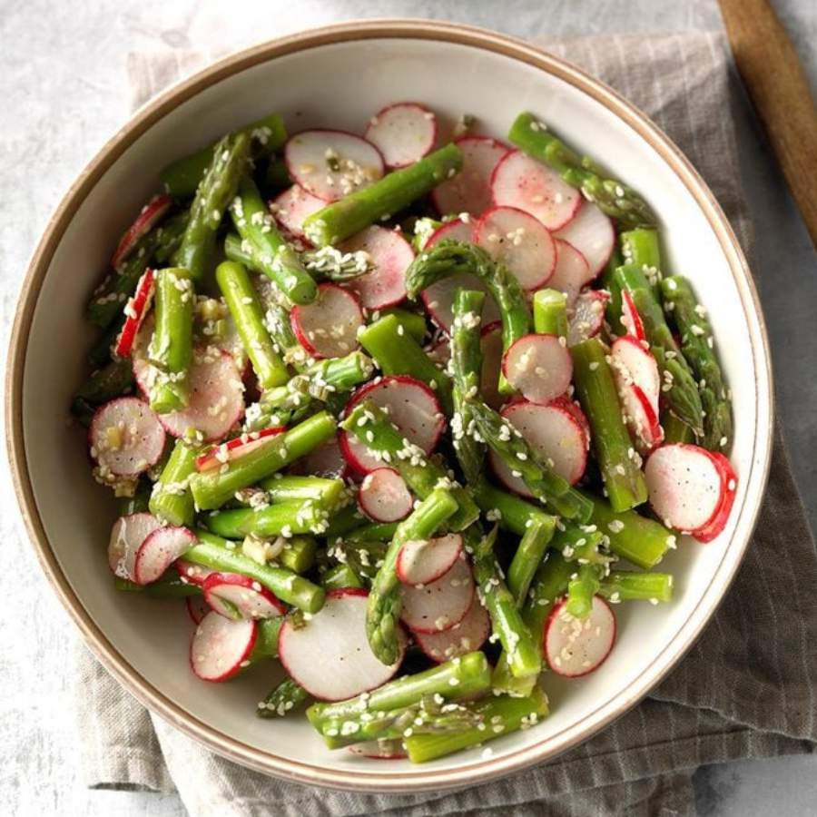 Dùng một cái bát, trộn măng tây với củ cải đỏ, dưa chuột và các thành phần nguyên liệu khác, trộn đều và thưởng thức