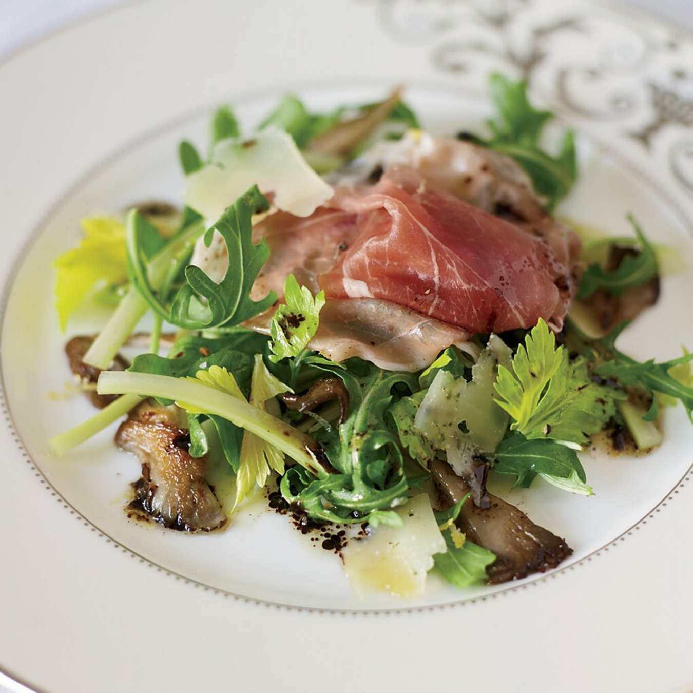 Xếp rau cải lông rocket trên một đĩa, cho giăm bông Prosciutto lên trên, tiếp theo thêm hỗn hợp nấm, cà chua sấy khô, thêm muối và tiêu, phô mai bào sợi Parmesan, mùi tây và thưởng thức