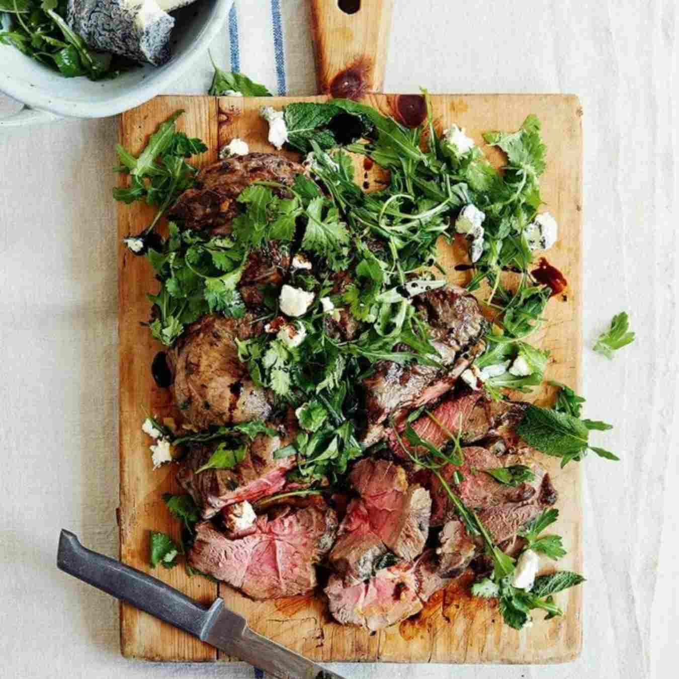 Uớp thịt cừu với muối, tiêu, 1 tbsp dầu ăn, cỏ xạ hương, thì là và tỏi băm, đặt lên một chiếc chảo nướng đã làm nóng trước ở lửa mức trung bình cao và nướng trong 40 phút, lật một lần
