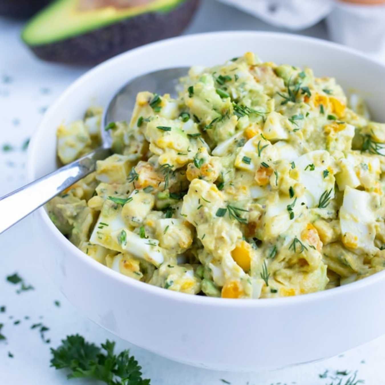Xả và rửa sạch bằng nước lạnh. Bóc vỏ, băm nhỏ rồi cho vào bát salad. Thêm sốt Mayonnaise, bơ, mù tạt, nước cốt chanh, mùi tây, thì là, muối và tiêu