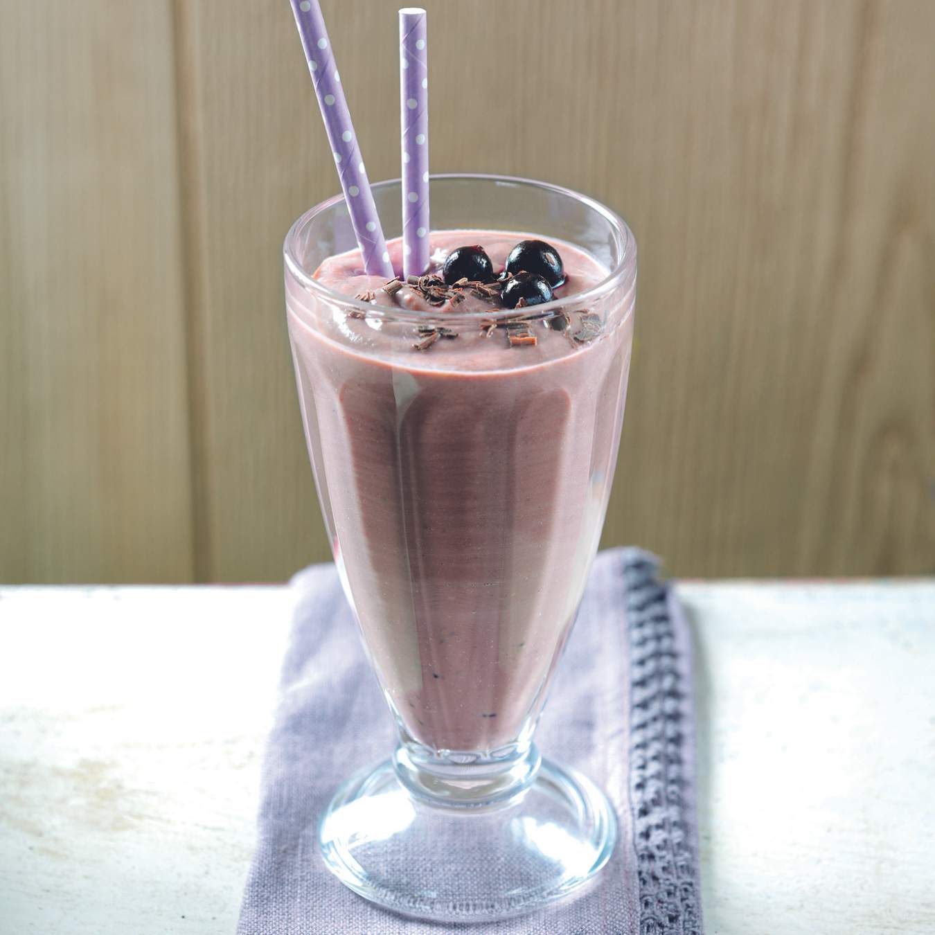 Dùng một máy xay sinh tố và thêm bột Whey, Stevia, sôcôla trắng, quả lý chua đen, hạt phỉ và xay cho đến khi mịn và đặc giống kem