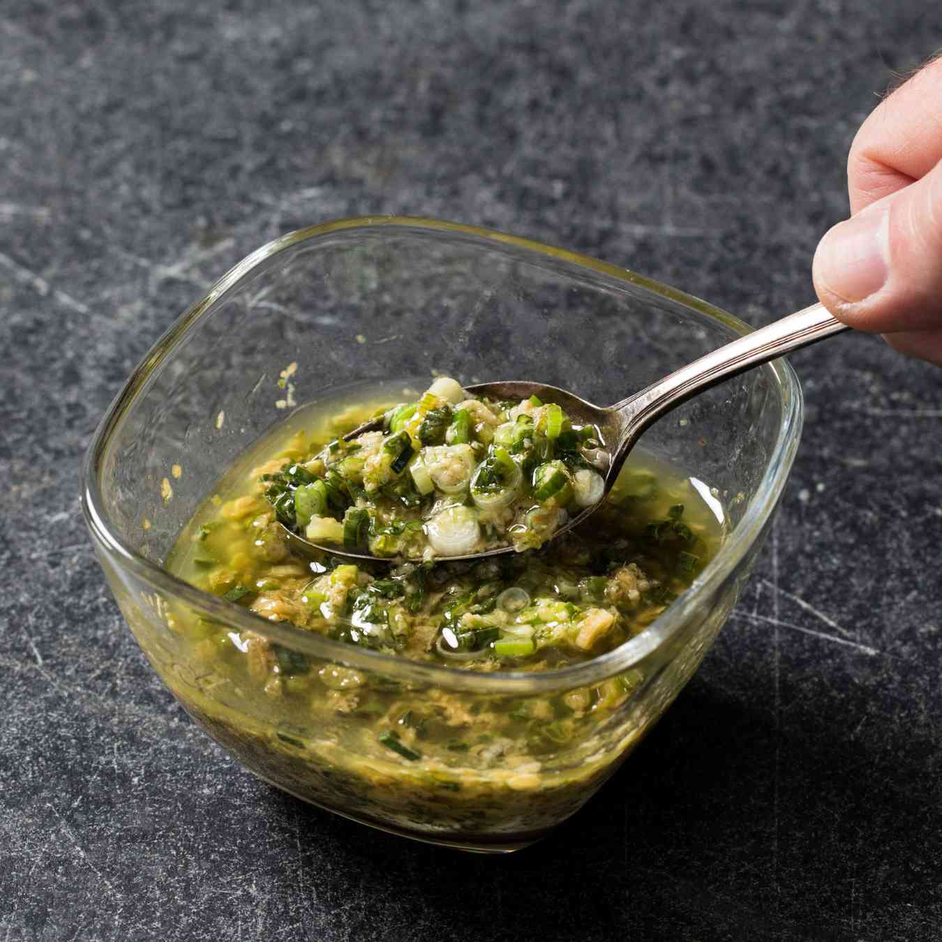 Đánh đều dầu, giấm và muối trong một bát khác. Cho hành và gừng lên trên và trộn với nhau