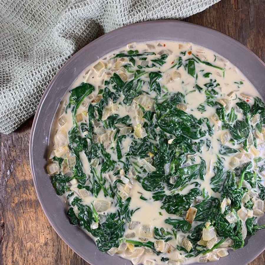 Cho kem dừa vào chảo, đun nóng trên lửa vừa, thêm cải cầu vồng, tỏi và các nguyên liệu khác vào, khuấy đều, nấu trong 10 phút