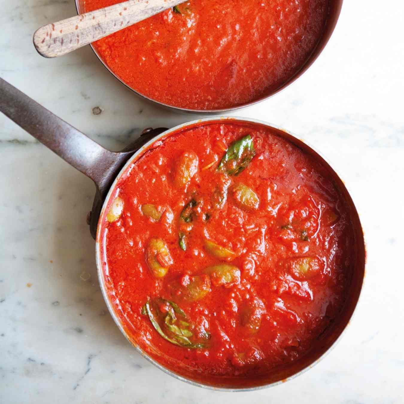 Cắt đôi quả cà chua sau đó cho vào nồi cùng với nước cốt. Đun trên lửa vừa trong 10 phút, không đậy nắp