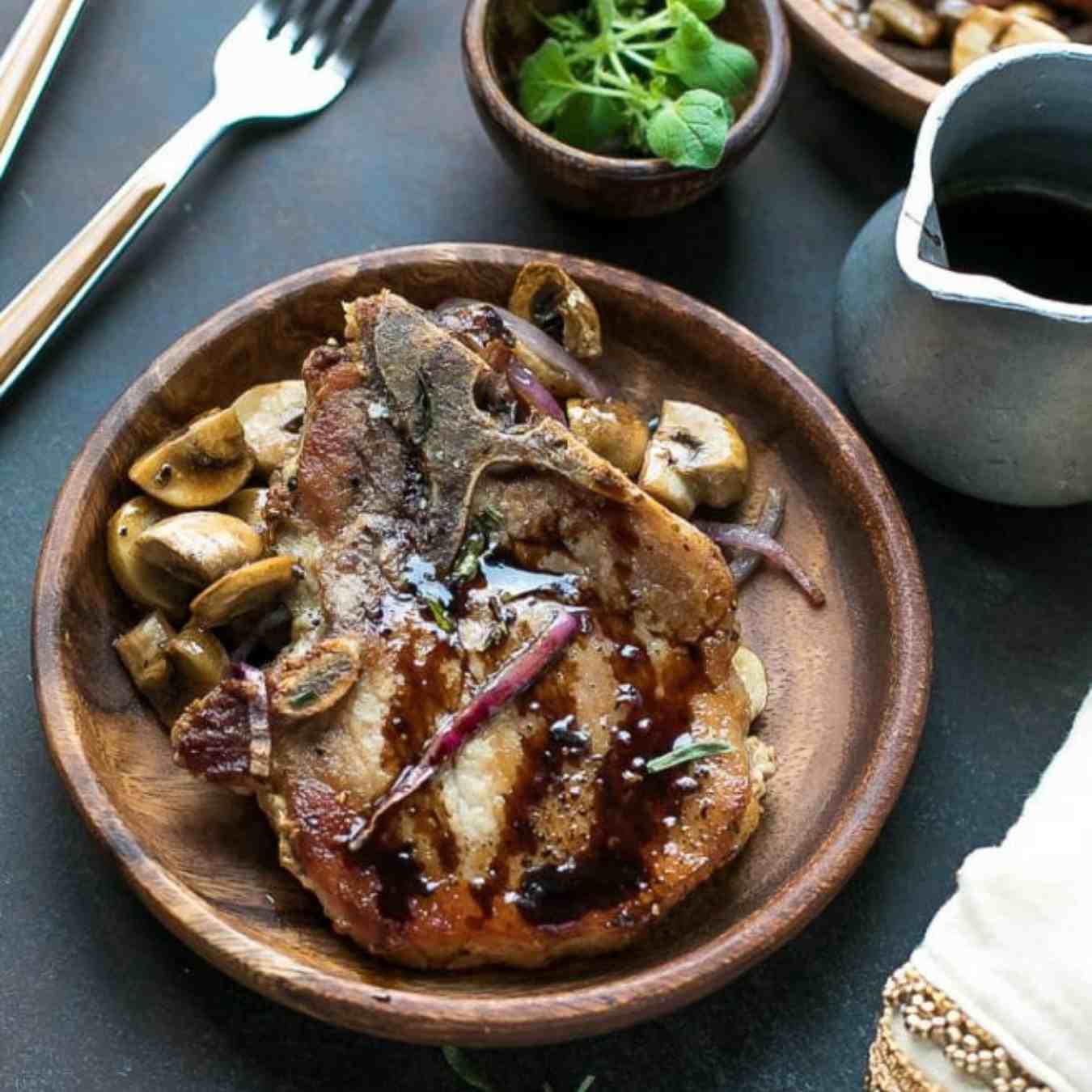 Cho sườn heo vào, nêm bột nhục đậu khấu và bột tỏi cho vàng đều hai mặt. Đặt chảo vào lò nướng ở 175ºC (350ºF) và nướng trong 30 phút