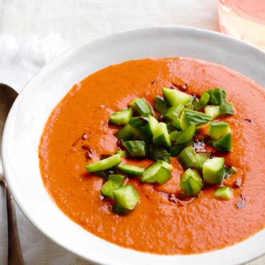 Dùng máy xay thực phẩm, trộn cà chua với trái bơ và các thành phần nguyên liệu khác, xay nhuyễn, chia vào bát và dùng lạnh