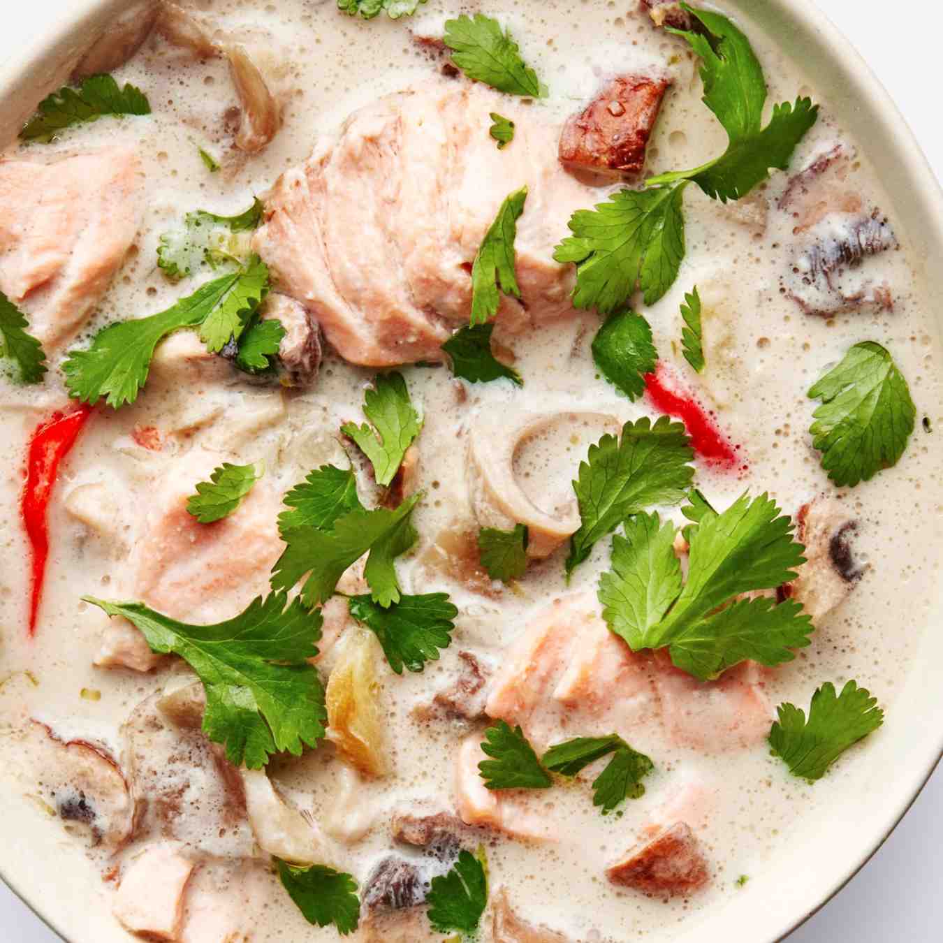 Thêm nước cốt dừa, cá hồi, khuấy đều và đun nhỏ lửa lại. Chia ra bát và thưởng thức