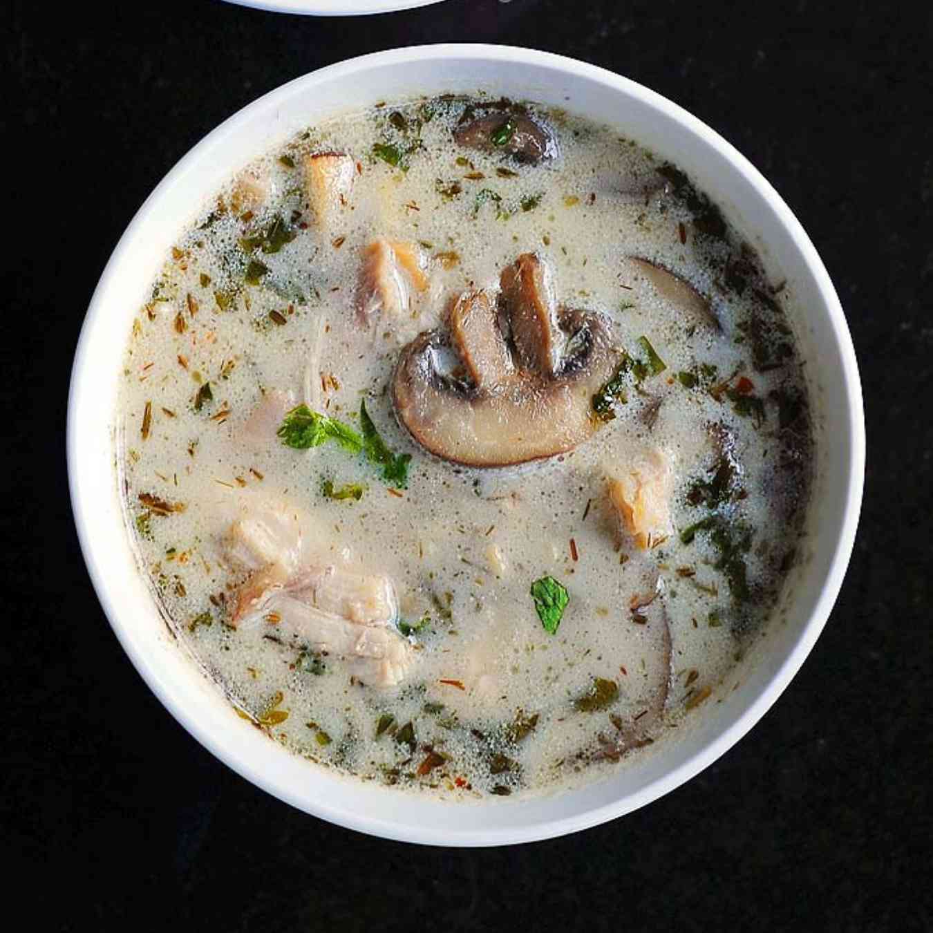 Đun lại súp ở lửa vừa. Cho dầu dừa, tôm, nước mắm, nấm, hành tây vào khuấy đều, nấu khoảng 10 phút