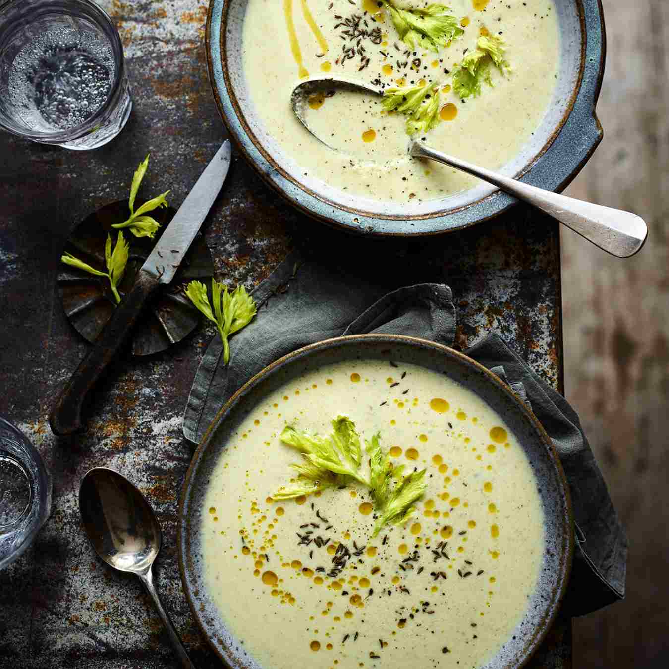 Làm nóng nồi với dầu ăn ở lửa vừa, cho cần tây, hành lá và tỏi vào xào trong 5 phút