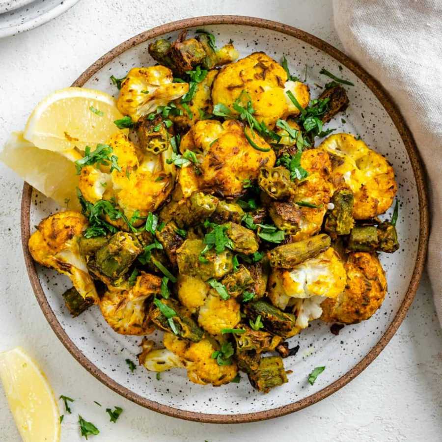 Dùng một chiếc chảo nướng, trộn súp lơ với đậu bắp và các nguyên liệu khác, đảo đều và nướng trong lò ở nhiệt độ 205°C trong 20 phút. Chia hỗn hợp ra các đĩa và thưởng thức