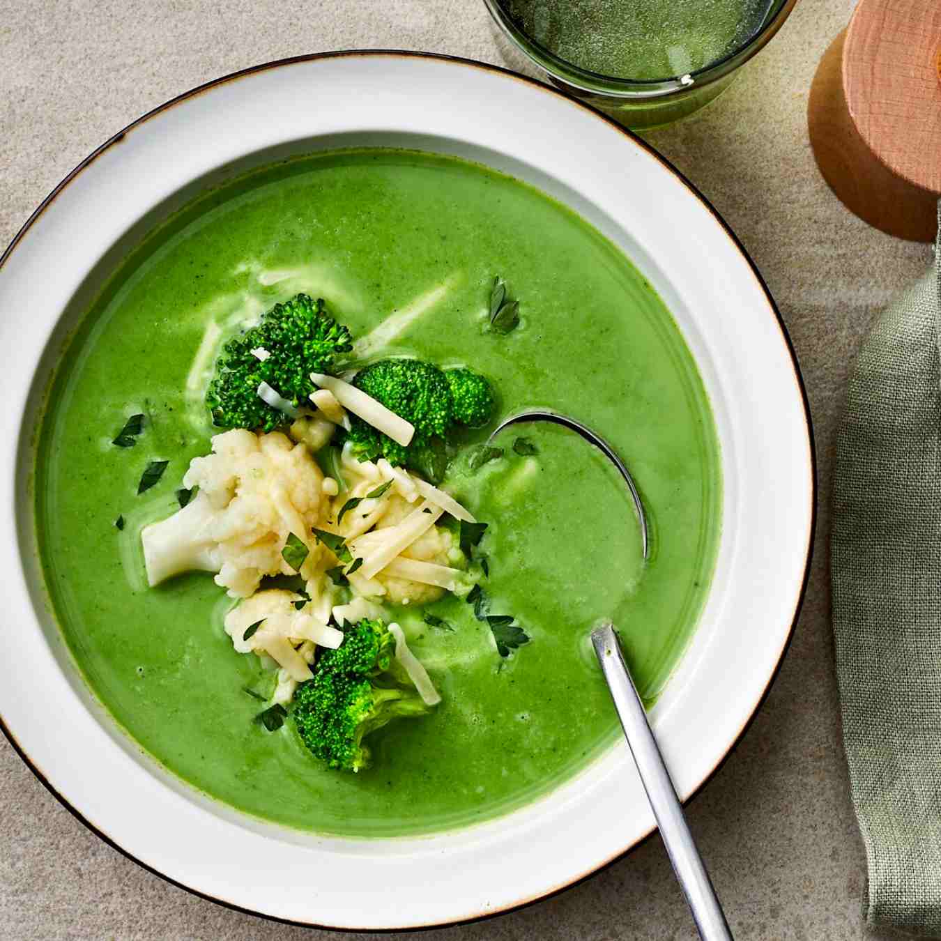 Cho muối, hạt tiêu, kem, mùi tây và rau chân vịt, nước cốt rau, kem dừa vào rồi xay bằng máy xay ngâm
