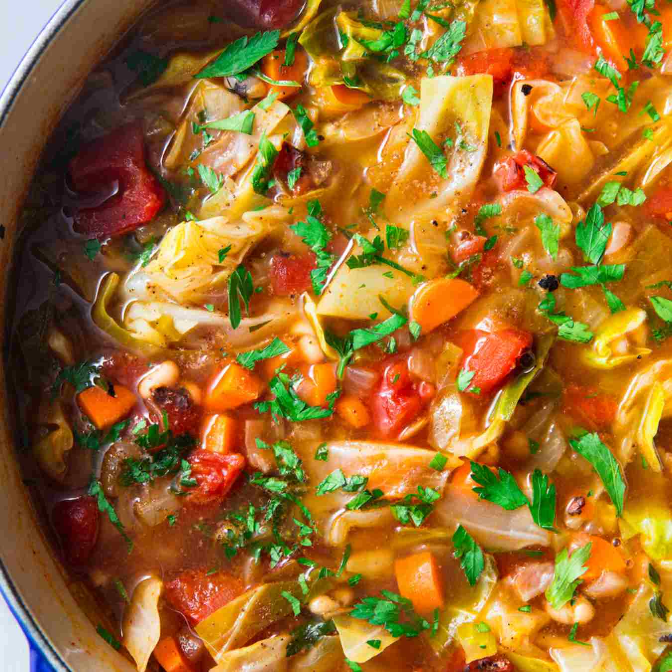 Đun nóng chảo, cho bắp cải, thìa là, tỏi, hành tây, cà chua, ớt, nước, nước cốt Bouillon, khuấy đều, đun sôi trên lửa lớn, đậy nắp, giảm nhiệt và nấu tiếp trong 40 phút