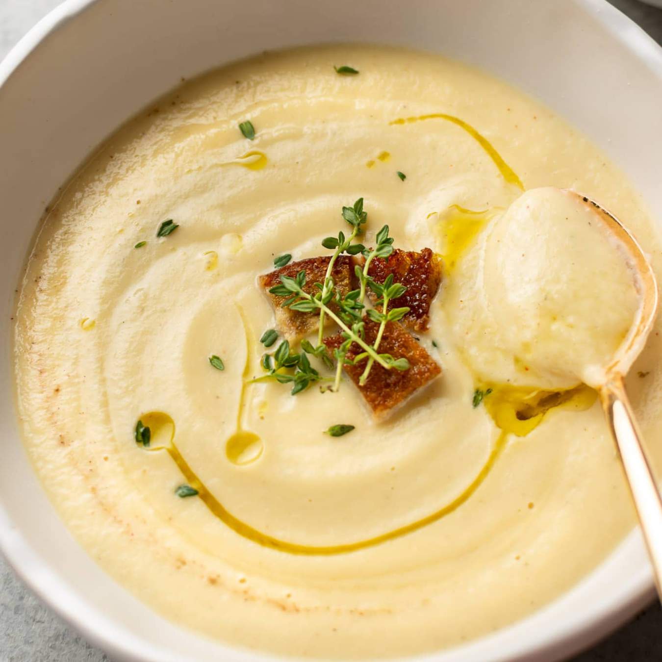 Cho nước cốt rau, súp lơ, tỏi, muối, tiêu vào khuấy đều và đun nhỏ lửa trong 10 phút