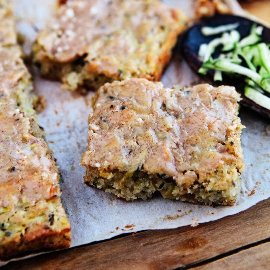 Dùng một cái bát, trộn bột hạnh nhân với bí ngòi, dừa sợi và các nguyên liệu khác (trừ dầu ăn dạng xịt) và trộn đều