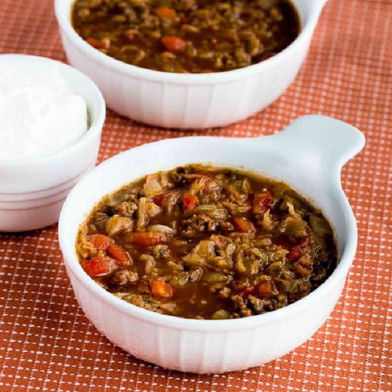 Dùng một chiếc nồi, trộn thịt gà, nước cốt bò, dưa cải bắp, Stevia, cà chua đóng hộp, sốt Worcestershire, mùi tây, cây xô thơm và lá nguyệt quế, khuấy đều và đun ở lửa vừa