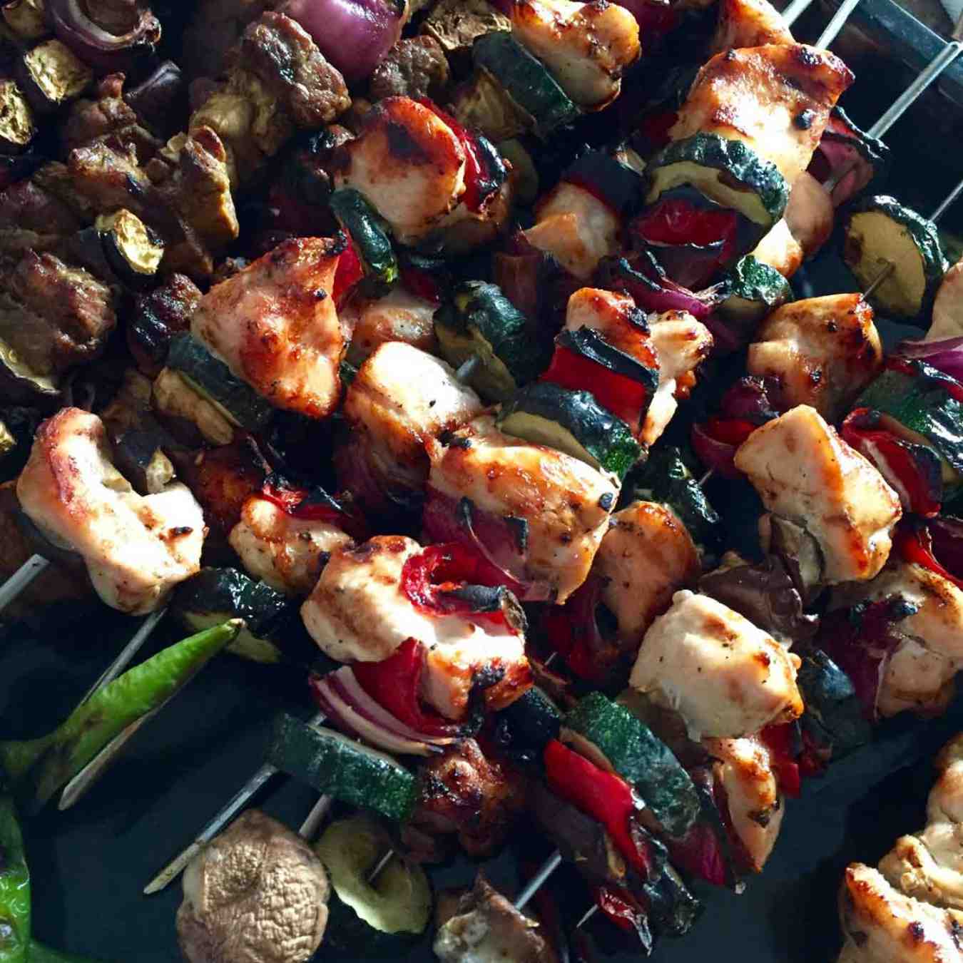 Xiên thịt bò, ớt chuông, bí ngòi và hành tây vào que xiên