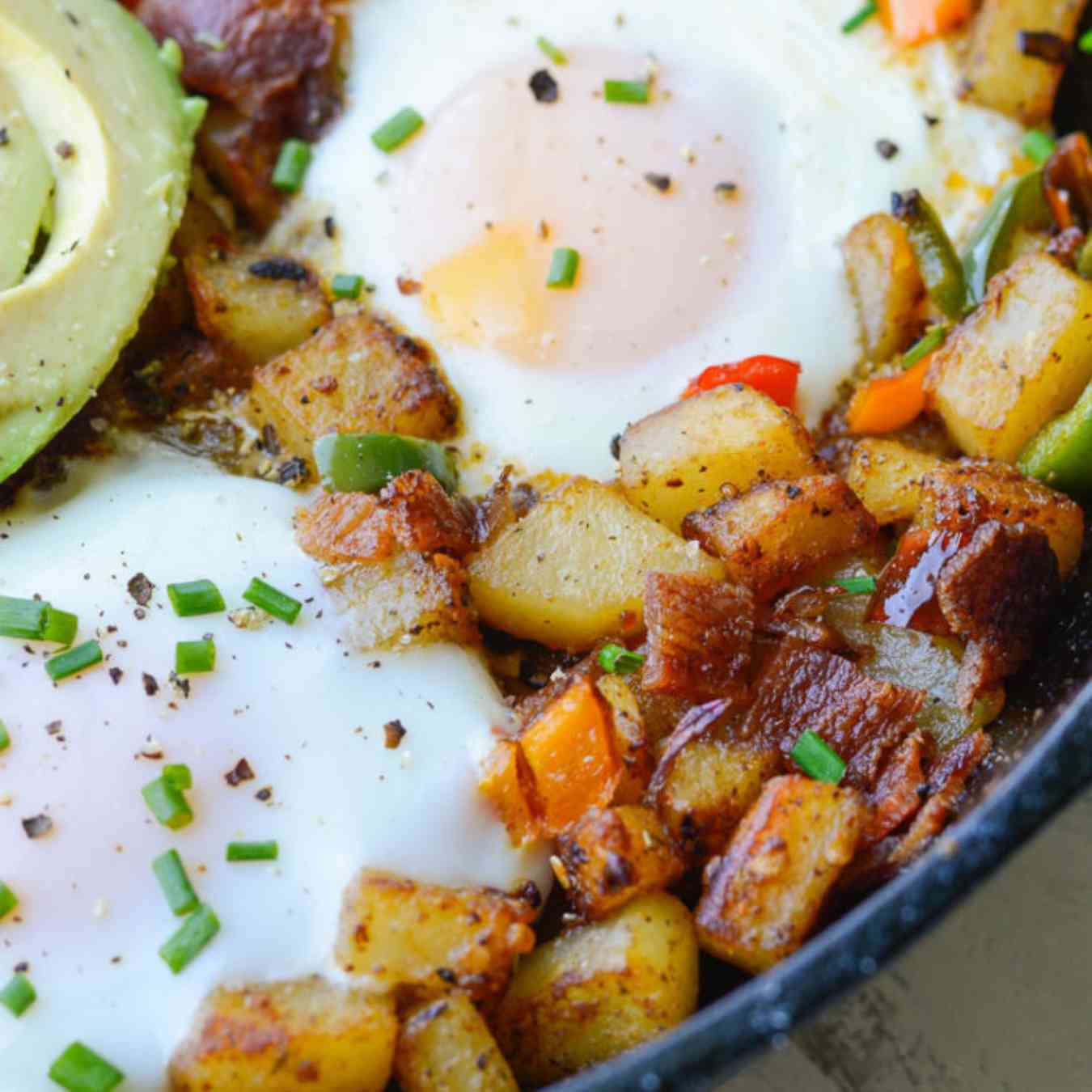 Rắc muối, tiêu, cà chua, hành tây và bơ lên trên cùng, dọn ra đĩa và thưởng thức