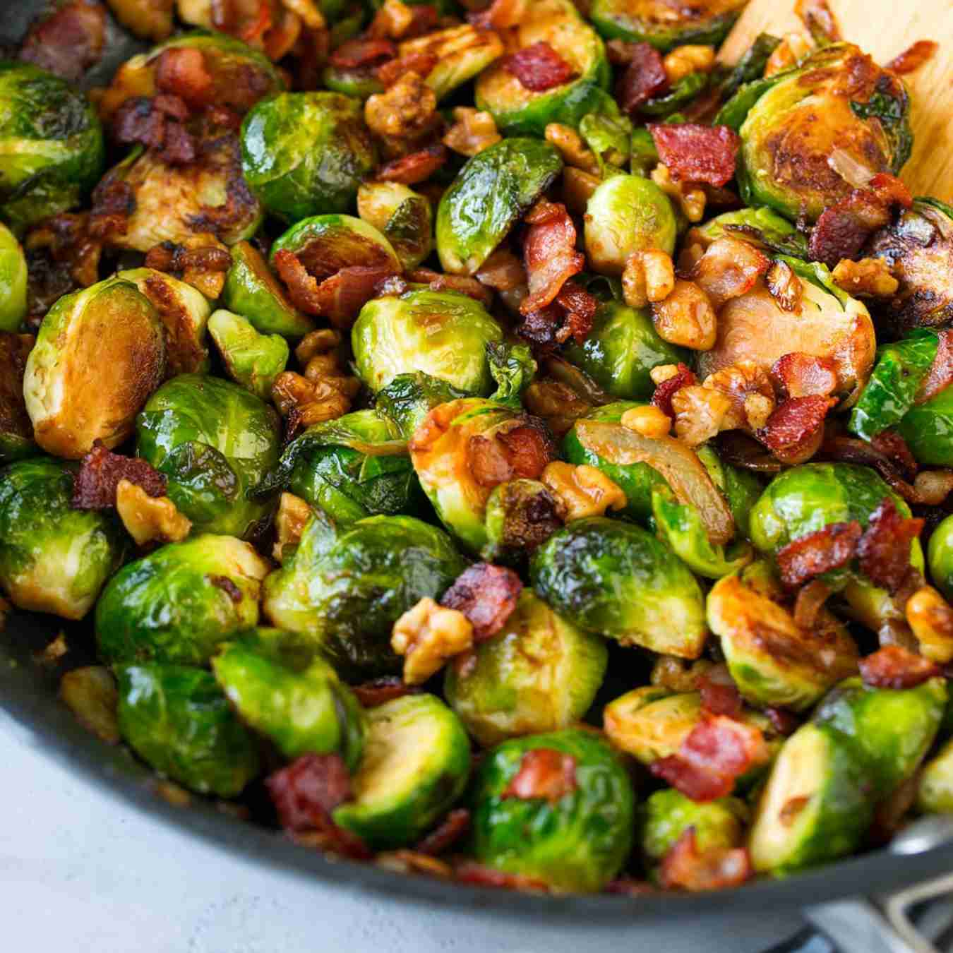 Đun nóng chảo trên lửa vừa, cho các miếng thịt heo xông khói vào chiên cho đến khi chín giòn. Chia bắp cải Brussels đã nướng ra đĩa, rắc thịt heo xông khói lên trên và thưởng thức