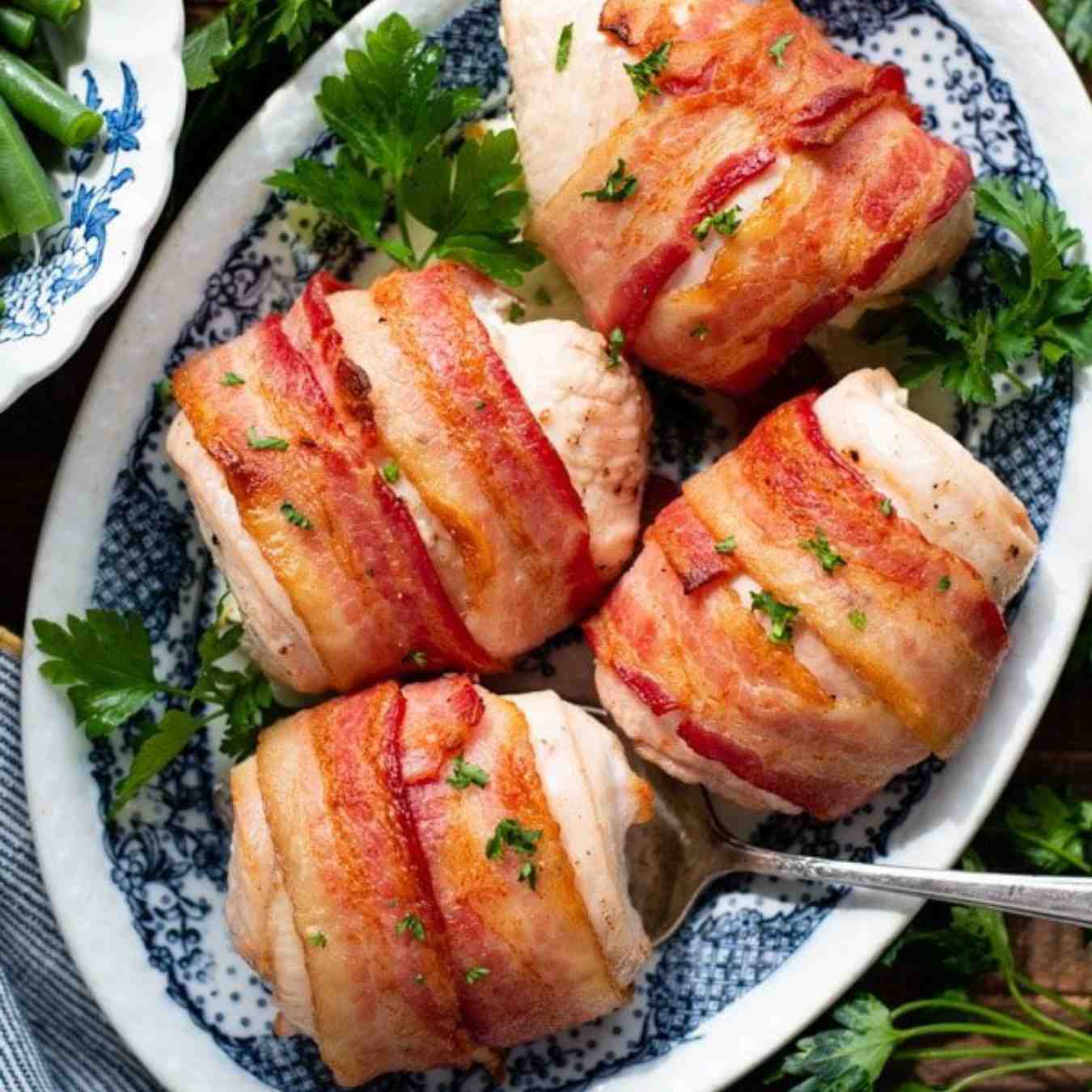 Xếp ức gà đã bọc thịt heo xông khói vào khay nướng, cho vào lò nướng ở nhiệt độ 190ºC (375ºF) và nướng trong 30 phút