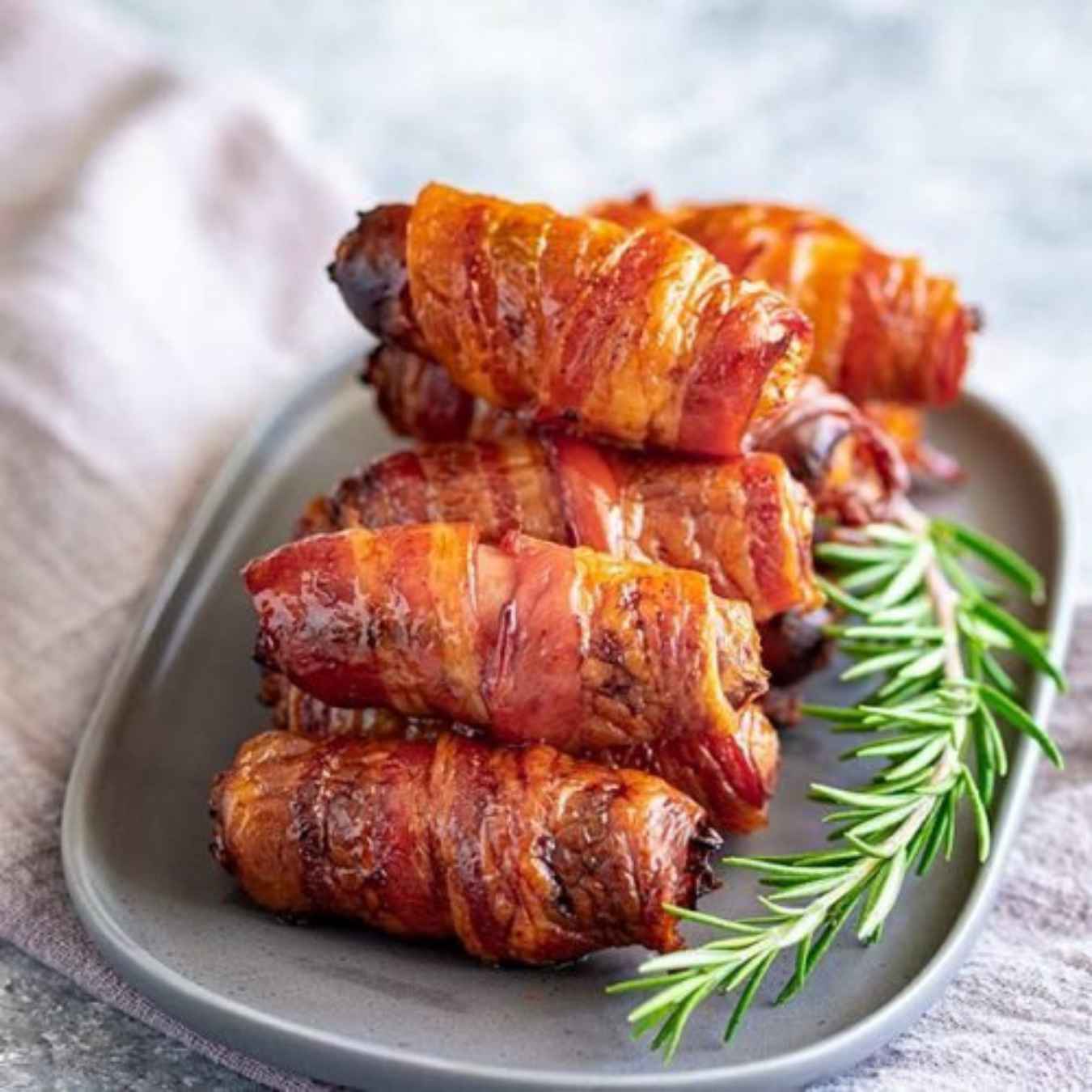 Mỗi miếng xúc xích nhồi sẽ được cuốn trong một dải thịt heo xông khói và dùng tăm ghim cố định lại. Đặt lên trên khay nướng và chuyển vào lò để nướng ở nhiệt độ 200°C (400°F) trong khoảng 15 phút