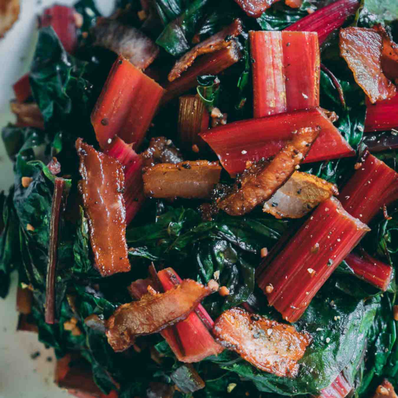 Khi hoàn thành, lấy chảo ra khỏi bếp, chia đều cải cầu vồng và thịt heo xông khói vào các đĩa và thưởng thức