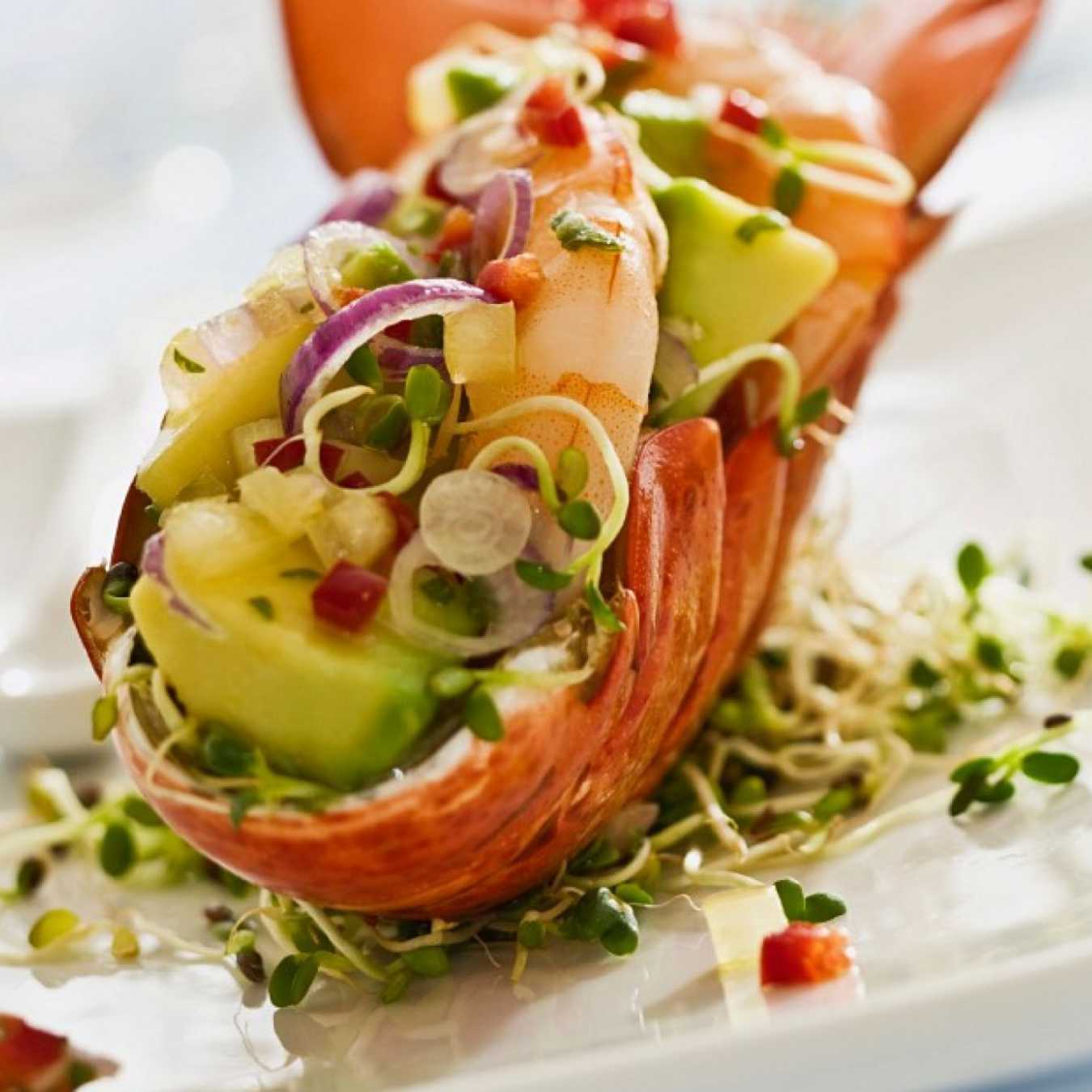 Trộn đuôi tôm hùm với bơ, dưa chuột, mùi tây, muối, tiêu, dầu và nước cốt chanh trong một cái bát