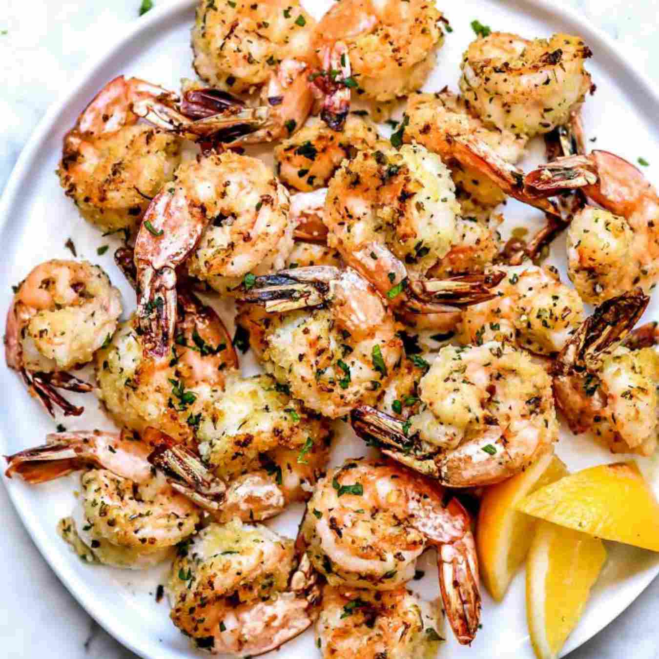 Cho tôm vào khay nướng, thêm ớt chuông, bột tỏi, muối và hạt tiêu