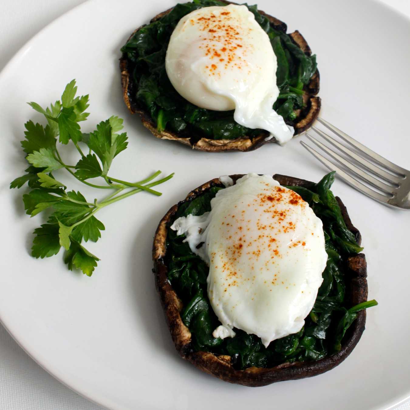 Đặt ngửa cây nấm trên đĩa. Cho một nửa rau chân vịt đã nấu chín lên trên (chú ý chắt bỏ hết nước thừa), cho thêm cá hồi hun khói và 1 quả trứng trần và thưởng thức