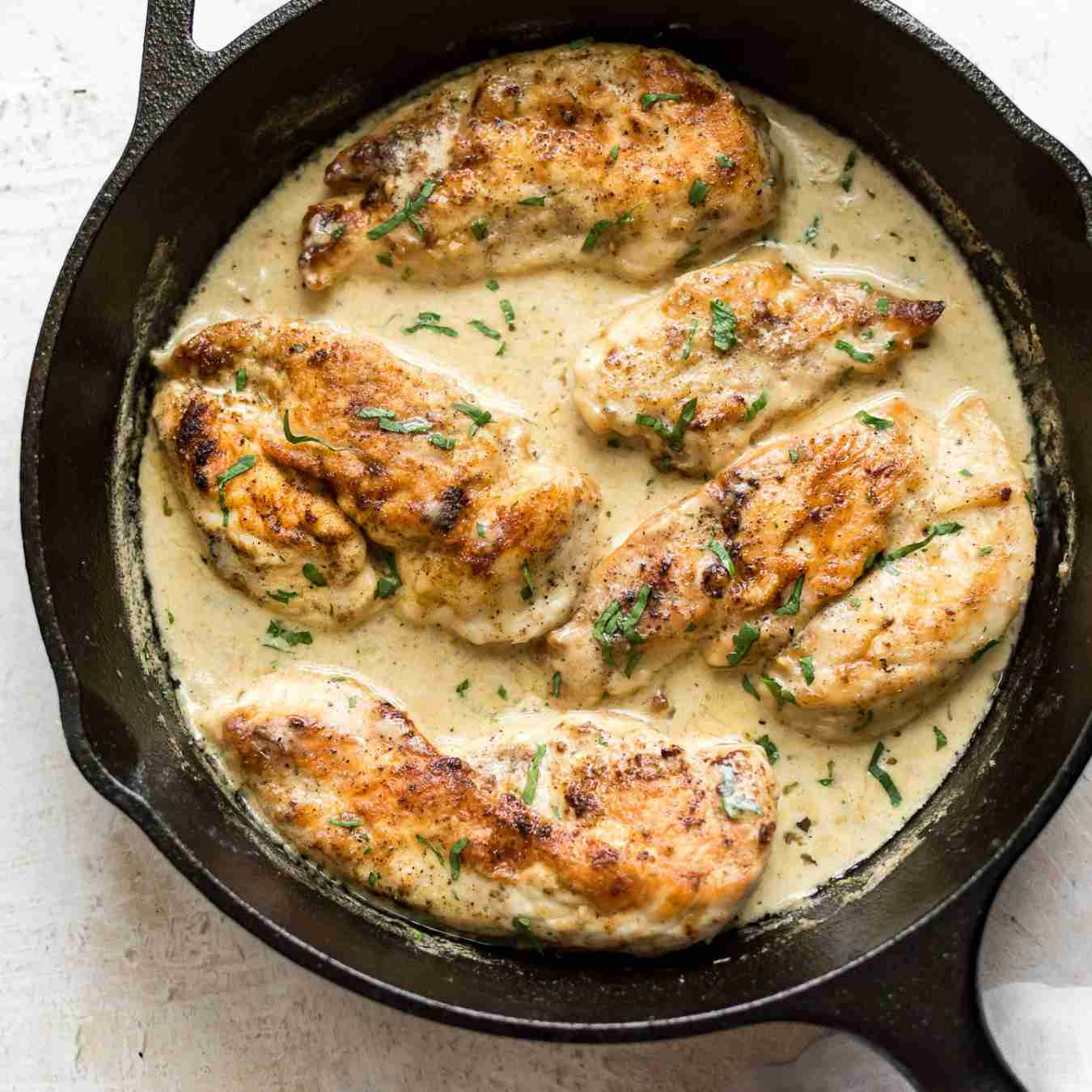 Đun nóng chảo với bơ, cho thịt gà vào, nêm muối và tiêu, đậy nắp, giảm lửa và nấu trên lửa nhỏ trong 10 phút