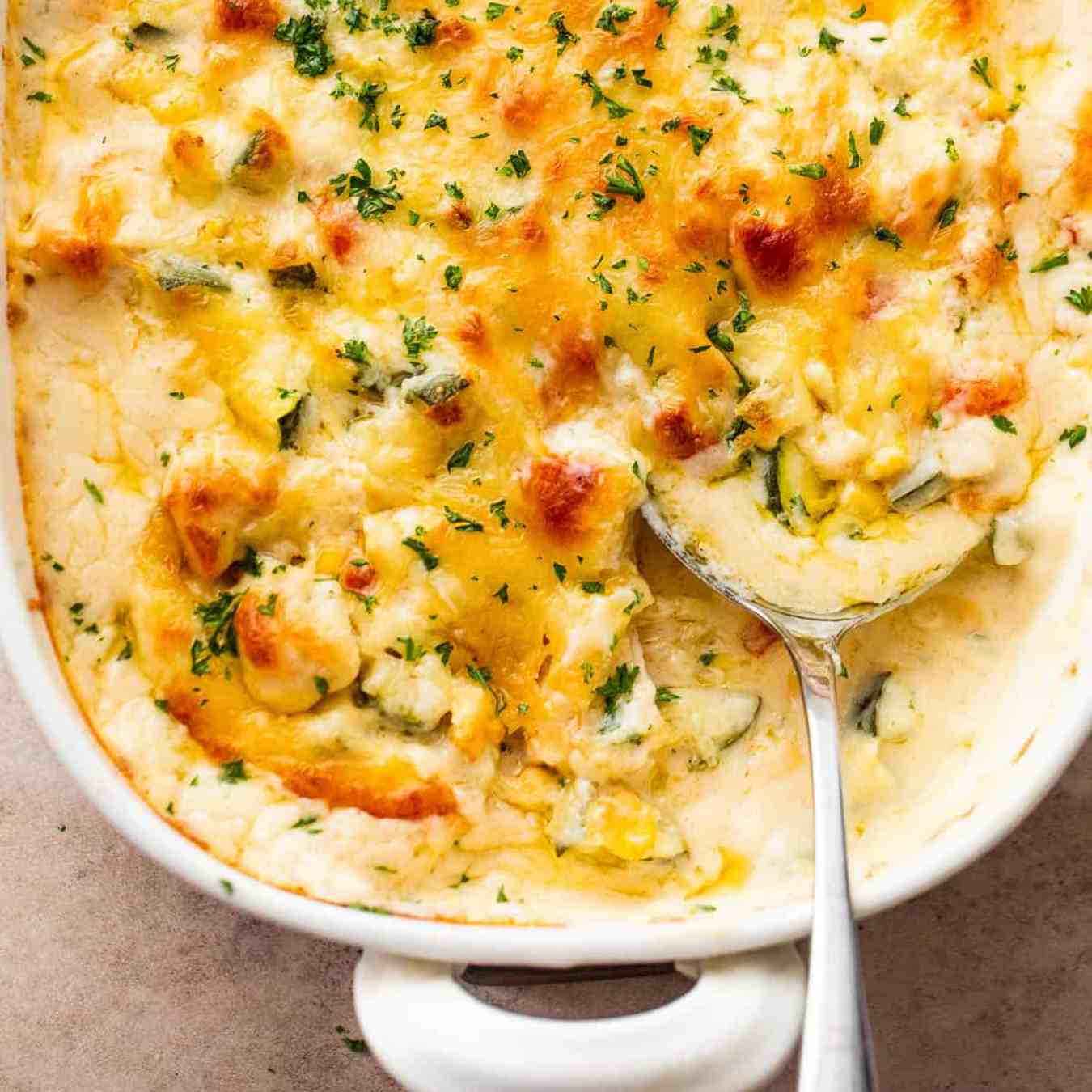 Đun nóng chảo trở lại trên lửa vừa, cho bí ngòi, rau kinh giới, cà chua, húng quế, muối và hạt tiêu vào, đảo đều, xào trong 2 phút rồi cho thịt gà vào
