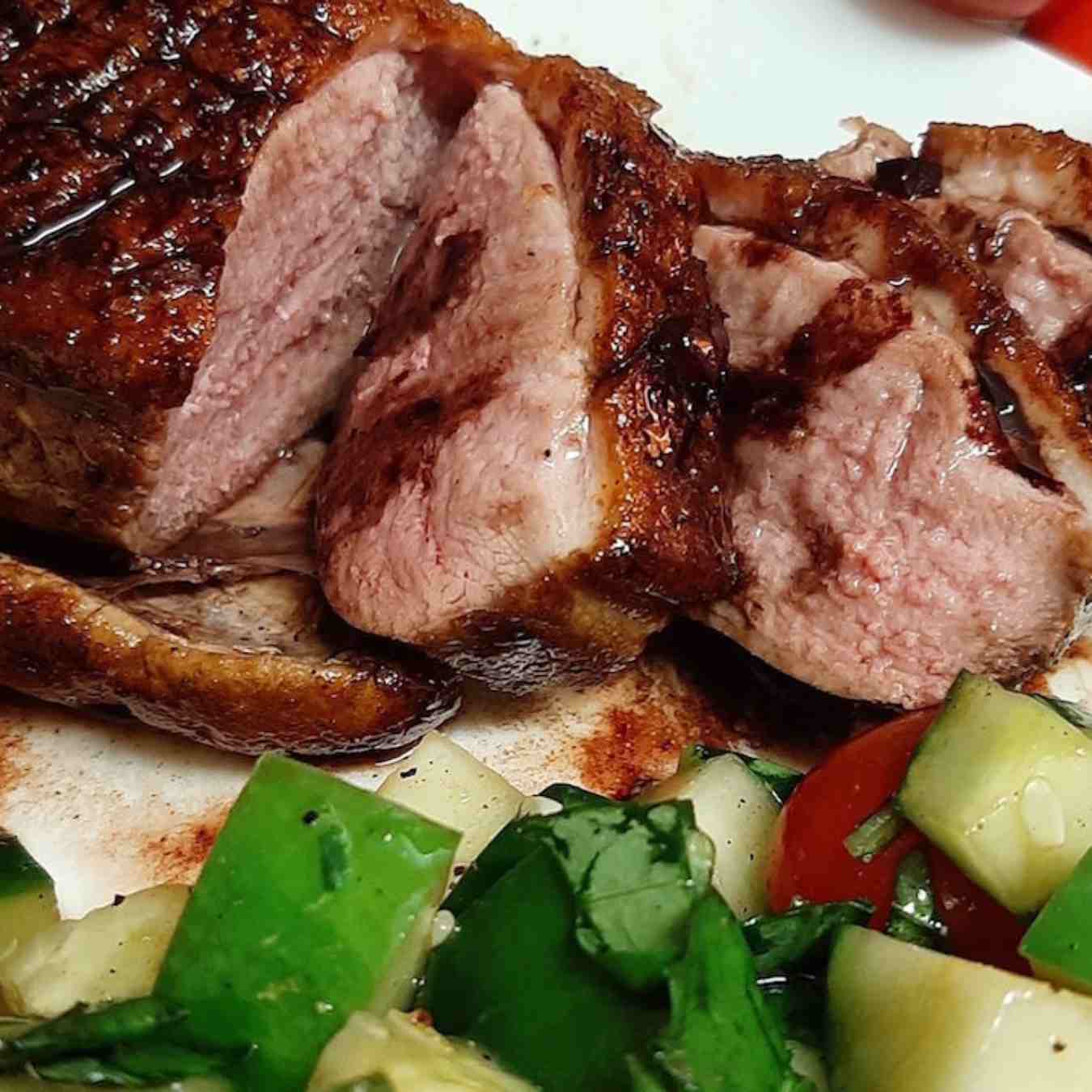Đun nóng một chảo khác trên lửa vừa, cho ức vịt vào, rán mỗi mặt trong 3 phút rồi cho thịt vịt vào chảo rau