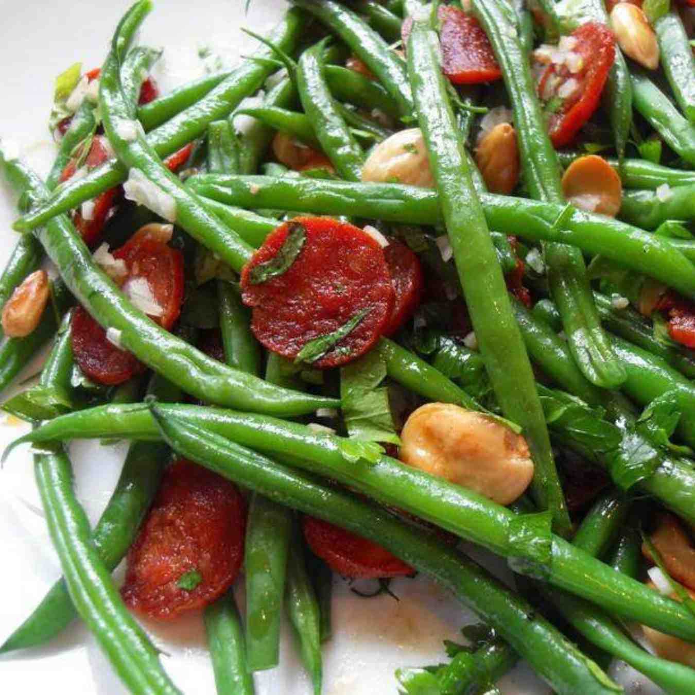 Đun nóng chảo với dầu dừa ở lửa vừa, cho đậu que và hỗn hợp xúc xích Chorizo vào, đảo đều và nấu trong 10 phút