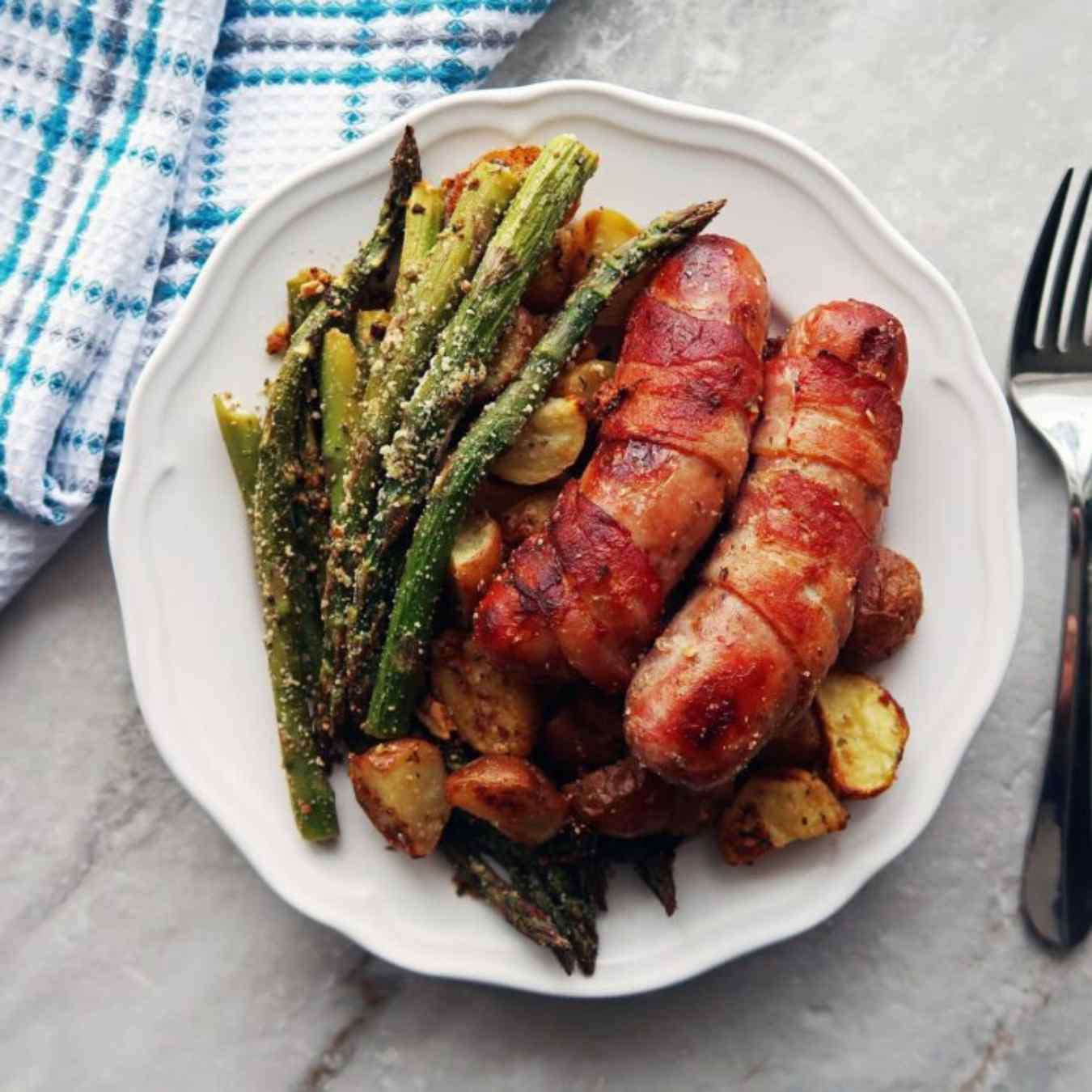 Bọc từng viên xúc xích đã nhồi bằng một dải thịt heo xông khói, cố định bằng tăm, đặt lên khay nướng đã lót sẵn giấy bạc, cho vào lò nướng ở nhiệt độ 200ºC (400ºF) và nướng trong 15 phút rồi dọn ra đĩa